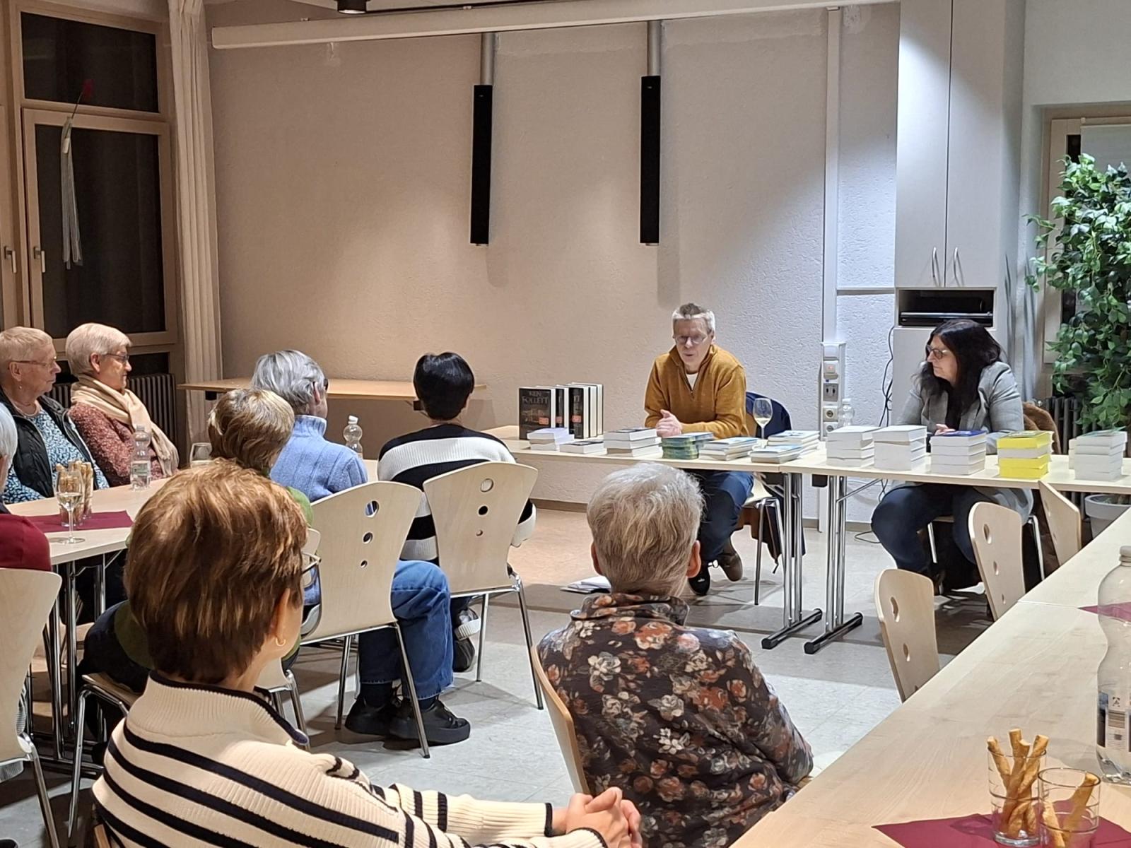 Während Frau Stangl die Fachfrau für Krimis und Thriller ist, ist Martin Käck unter anderem der Fachmann für Historische Romane und Humoristisches. Entsprechend ihren Schwerpunkten hatten sie einige neue Bücher mitgebracht. Ihre Empfehlungen reichten von Timur Vermes` „Briefe von morgen...“ über Ken Folletts „Stonehenge“ bis hin zu den Büchern von Freida McFadden und „Achtsam morden“ von Karsten Dusse. Zusätzlich zu den inhaltlichen Informationen trugen auch das Hintergrundwissen der beiden Buchhändler sowie einige lustige Geschichten aus ihrem Berufsalltag zur Unterhaltung bei.