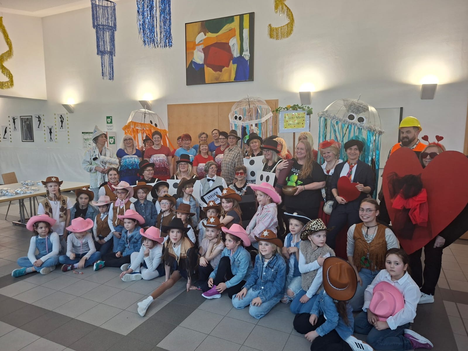Es folgte eine große DJK-Mädchengruppe unter Leitung von Johanna Kippes mit einem schmissigen Cowboy-Tanz. Der Sketch „Die „Stellenanzeige - spätere Heirat erwünscht“ mit Regina Schmid und Waltraud Näger sorgte für große Heiterkeit.