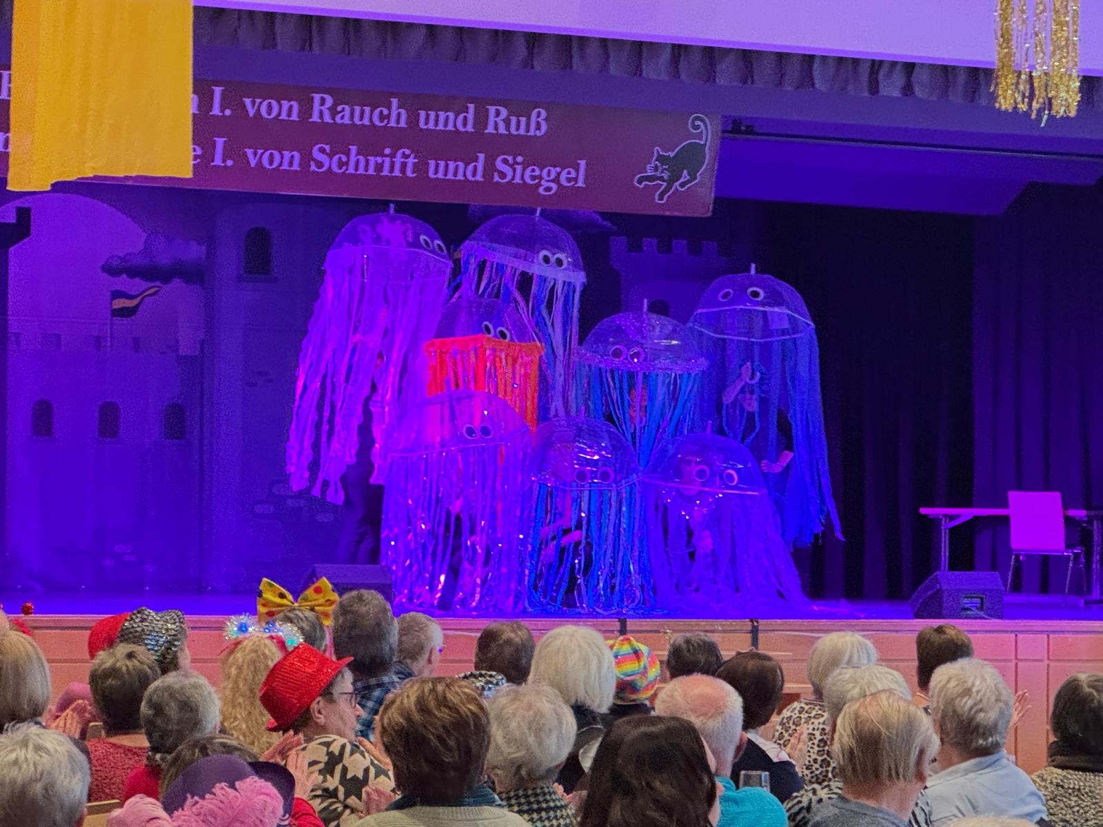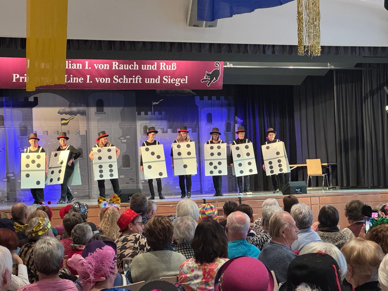 Acht Frauen tanzten als farbige Quallen. Natürlich durfte eine kleine Büttenrede von Regina Schmid über das Rathausgeschehen nicht fehlen. Frauen tanzten zur Tangomusik als Dominosteine auf der Bühne. Anschließend mussten Bürgermeister Sebastian Giering, Tanja Kippes und Gerhard Steiner rasch die Punktzahlen auf den Dominosteinen in dreifacher Weise zählen. Weitere Sketche „Die Katze“ mit Erika Neid und Sigrid Gierisch und „Traummann gesucht“ mit Renate Weiß erheiterten das Publikum ebenfalls.