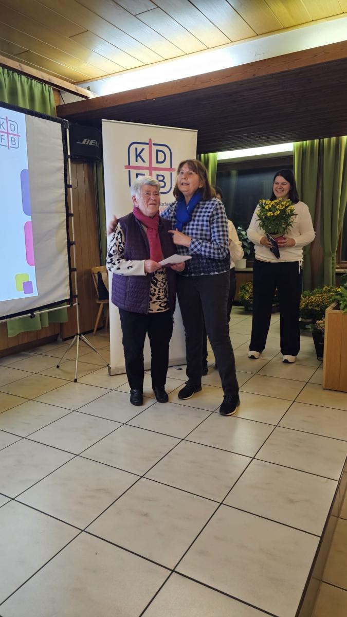 Vorsitzende Stefanie Hetz freute sich, dass so viele Jubilare anwesend waren und überreichte mit Bezirksvorsitzender Inge Trottmann die Urkunden und kleine Blumenpräsente.