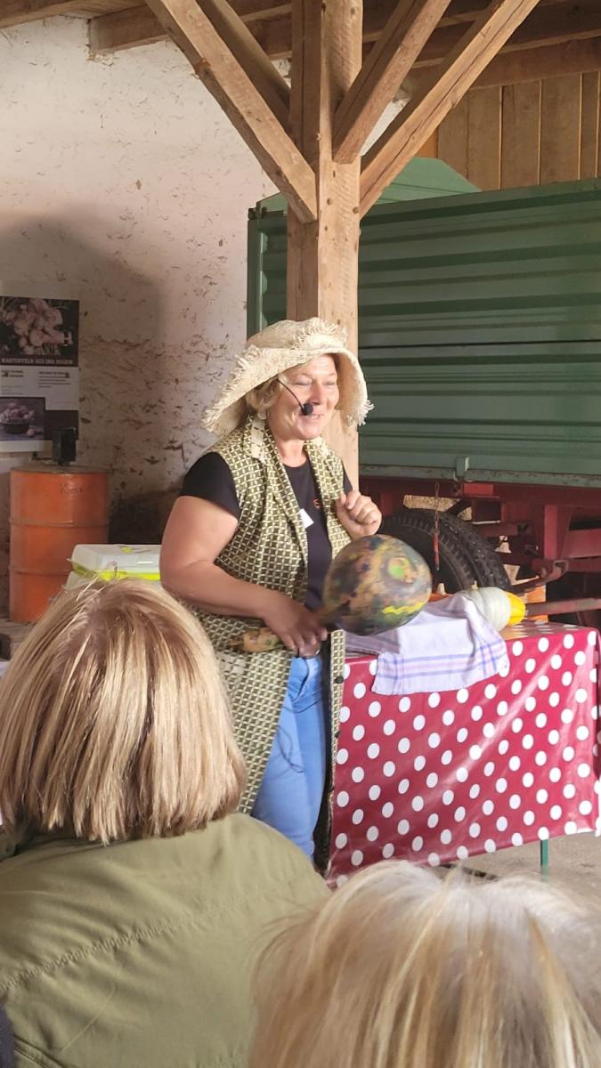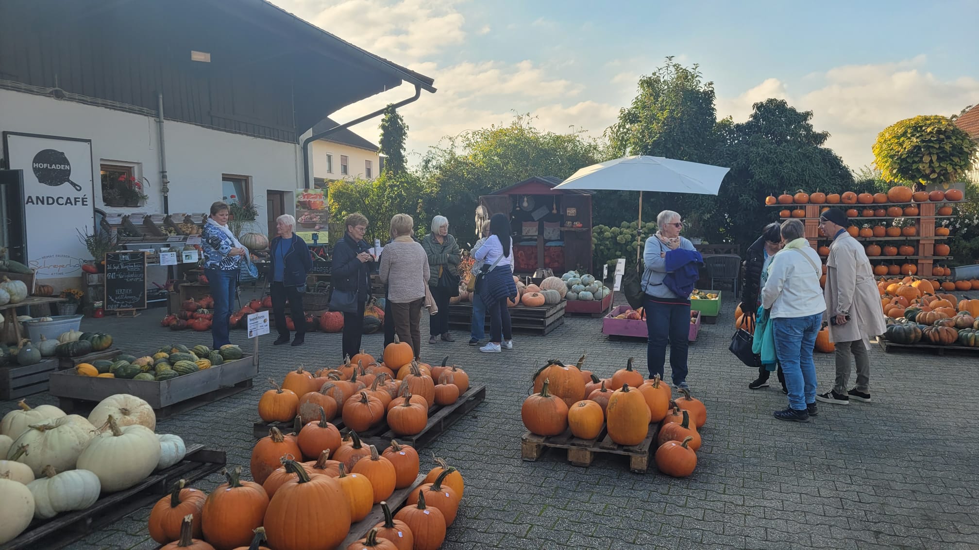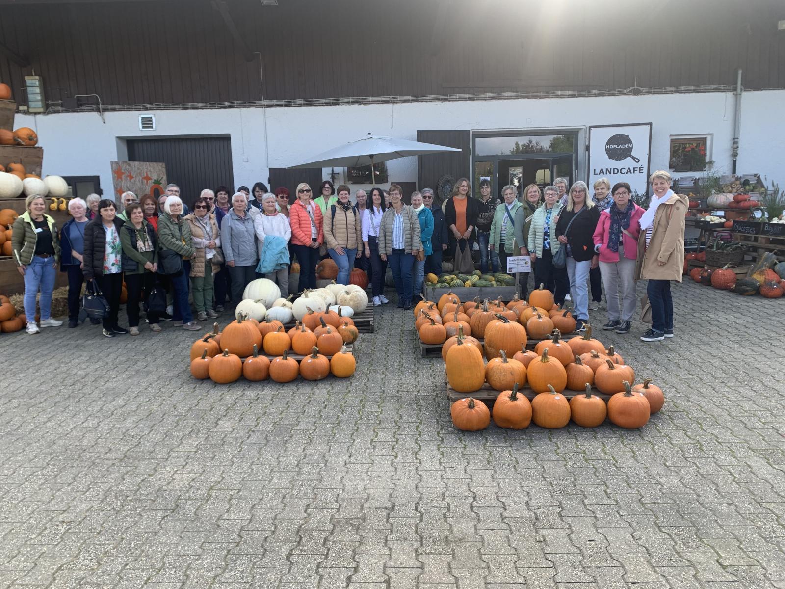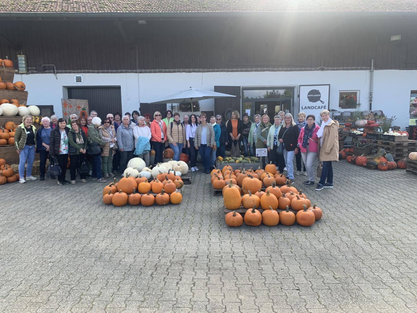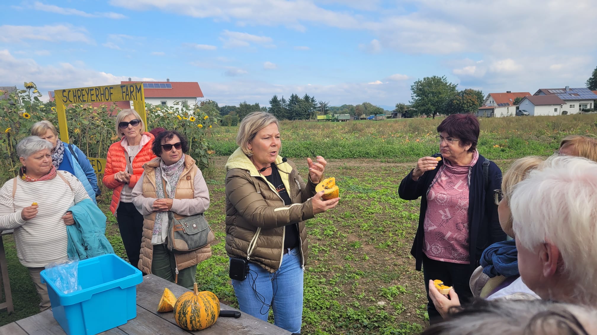 Am Nachmittag fuhr der Bus ins benachbarte Atting zum Kürbishof Schreyer. Dort wurden die Damen bereits mit einem Kürbissecco erwartet. Eine Erlebnistour von der Chefin Frau Schreyer mit Schauspieleinlagen und Interessantem rund um den Kürbis führte direkt auf den Acker, wo die verschiedensten Kürbissorten zu sehen waren. Die Führung endete direkt im Hofcafe mit selbstgebackenem Kürbiskuchen und Kaffee.