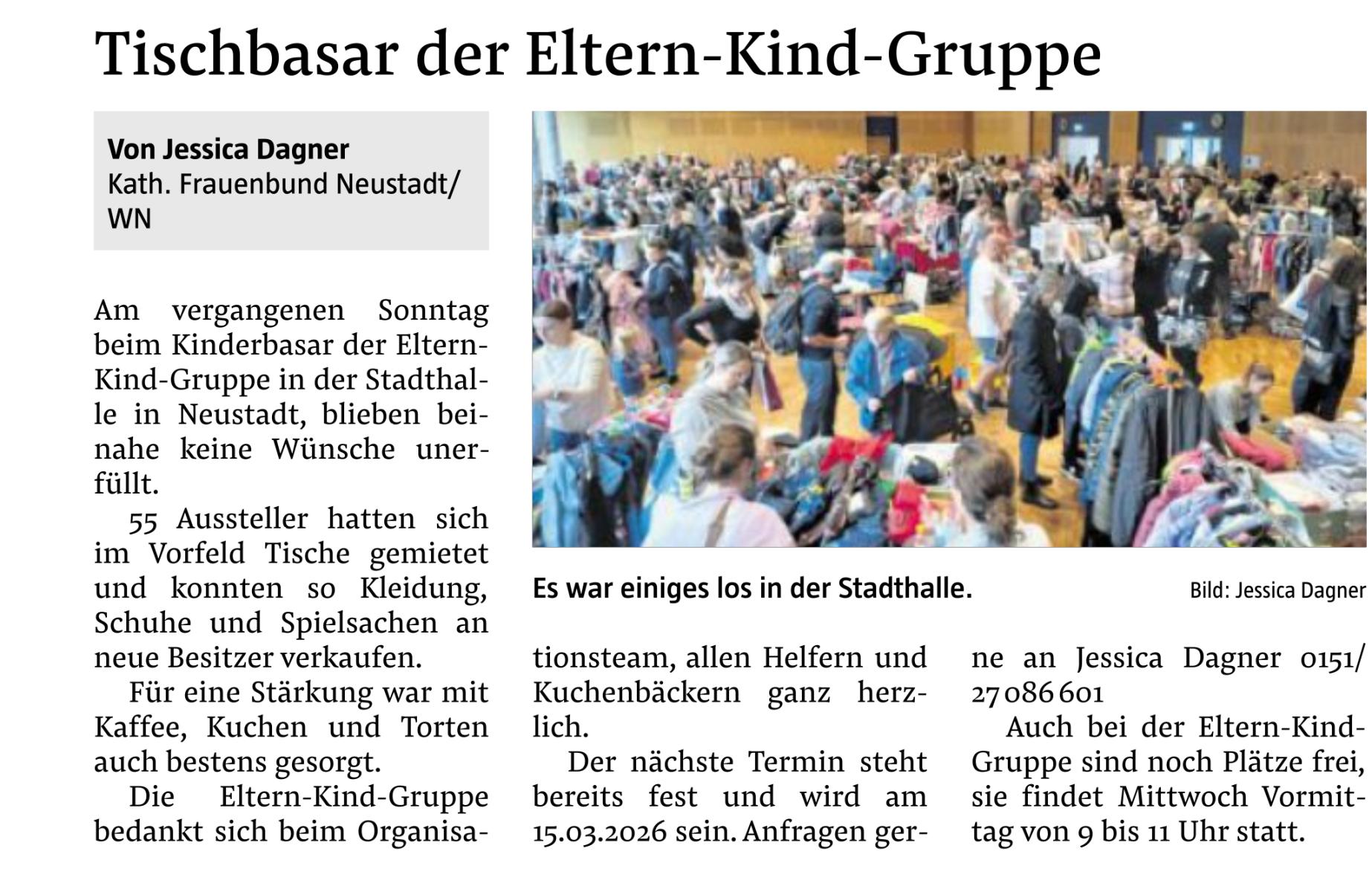 EKG Basar 2025 im September war wieder ein riesen Erfolg. Die Tische für das Frühjahr sind bereits wieder ausgebucht. In der Eltern-Kind-Gruppe sind wieder Plätze frei: immer Mittwochs von 9 bis 11 Uhr. Bitte bei J. Dagner melden: 0151 27 086 601 zurück